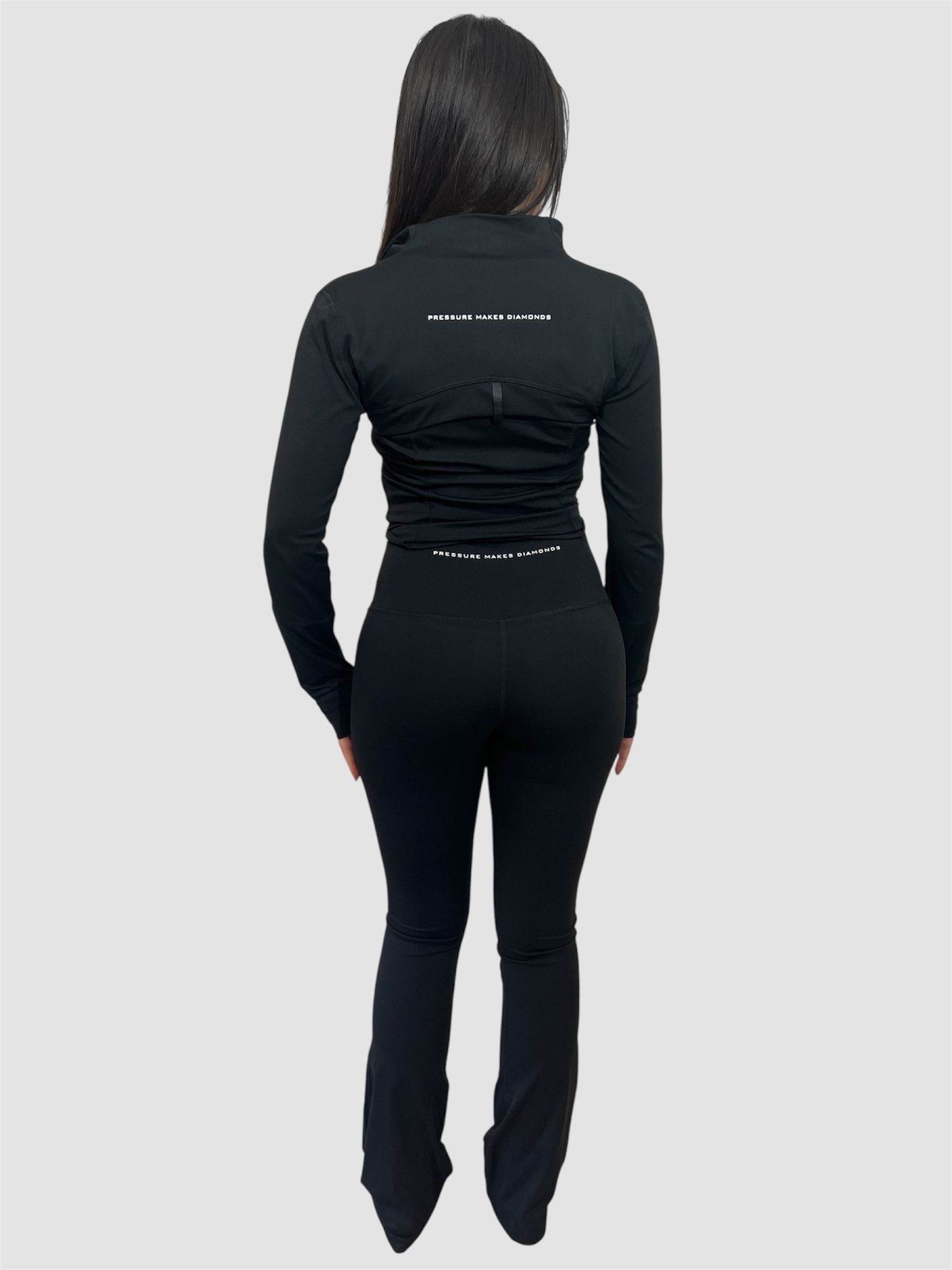 Timeless, clean, and made to move — the Women’s Black Flared Set brings everyday comfort with a sharp-edge finish. Featuring the same cropped zip-up jacket as our signature sets, paired with high-rise flared leggings, this set is finished with a crisp white logo for a bold yet minimal look.